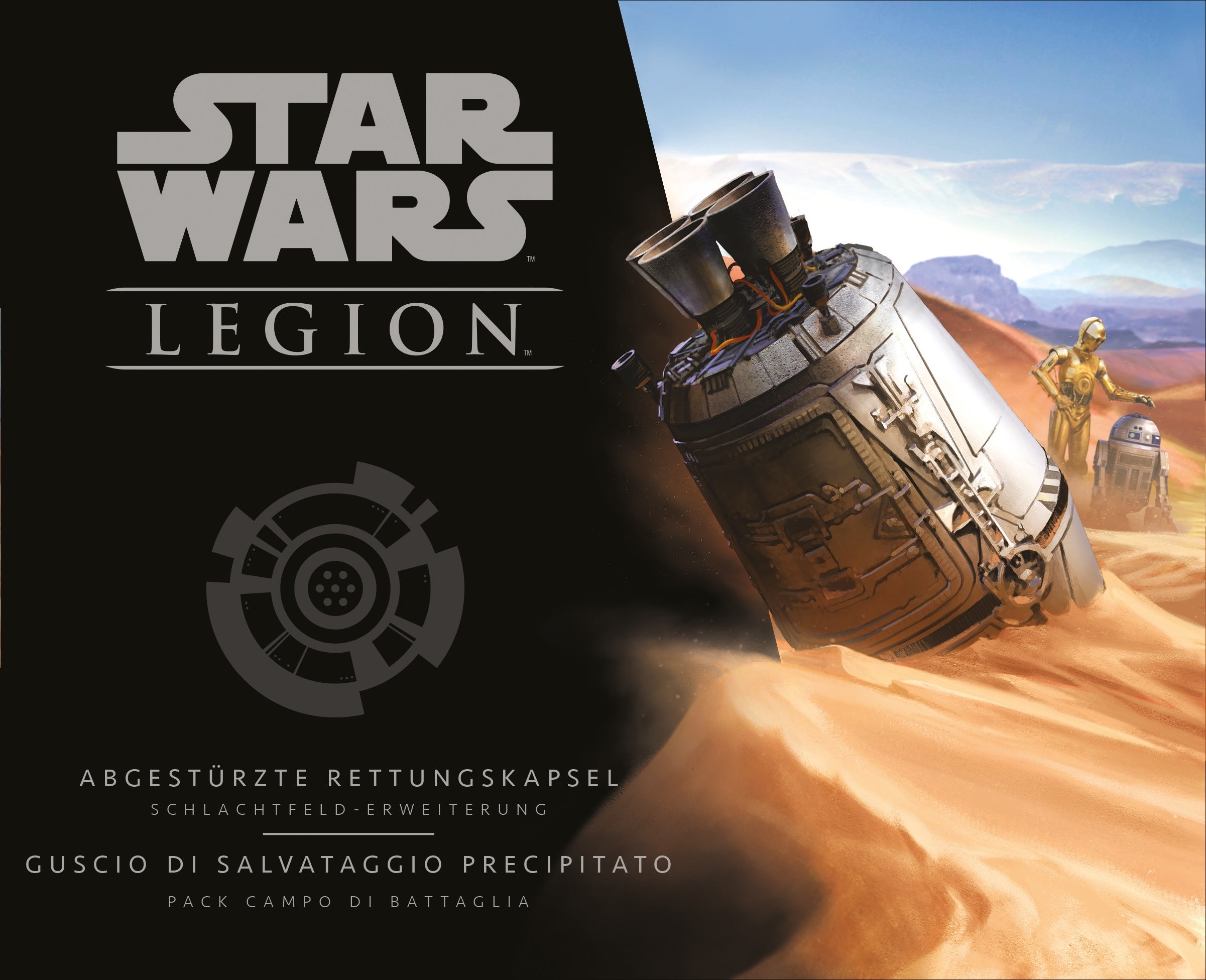Diese Erweiterung für Star Wars™: Legion enthält hochdetaillierte Miniaturen: Eine abgestürzte Rettungskapsel, einmal C-3PO und einmal R2-D2 sowie neue Einheiten-, Aufwertungs- und Kommandokarten.